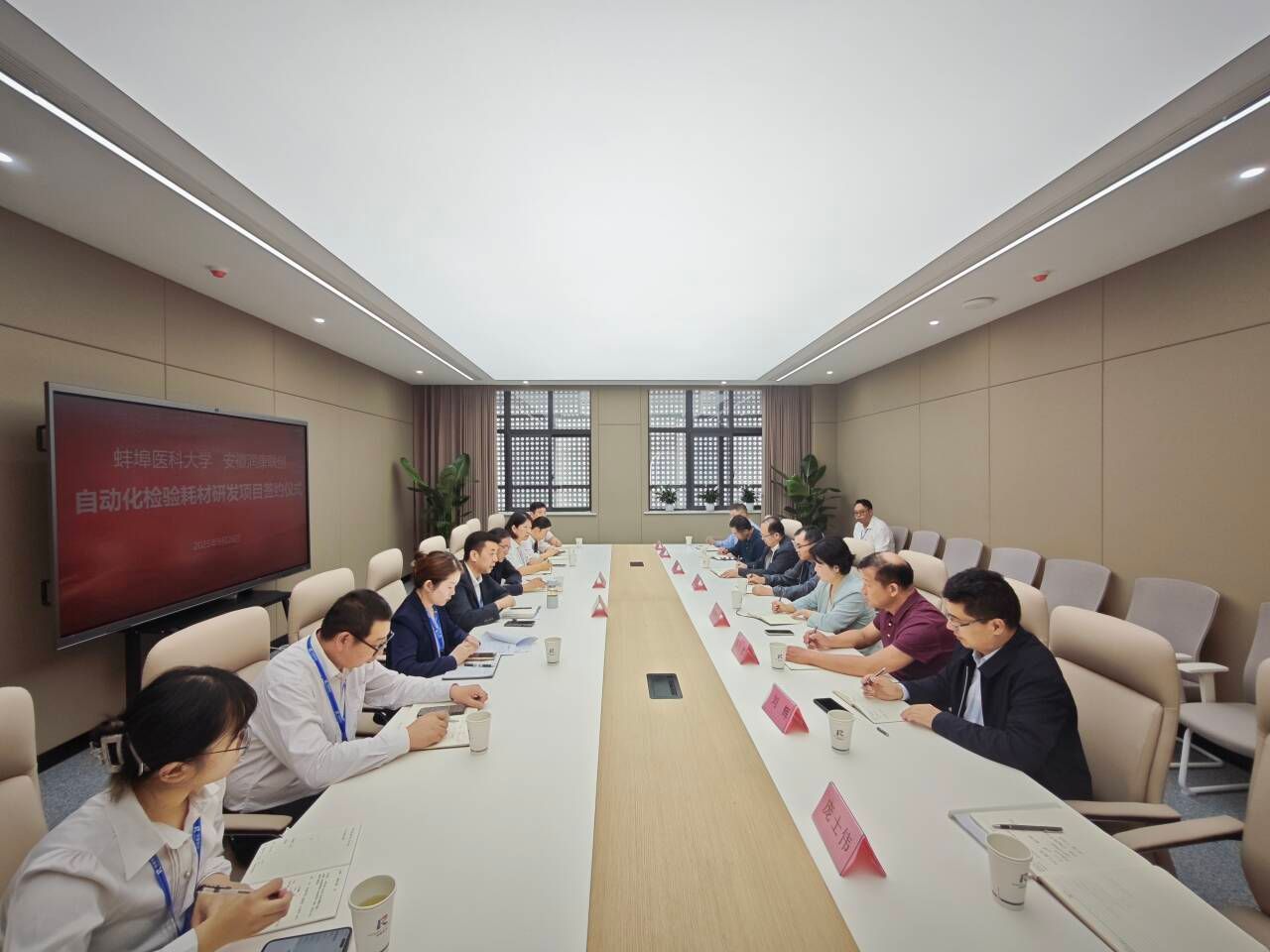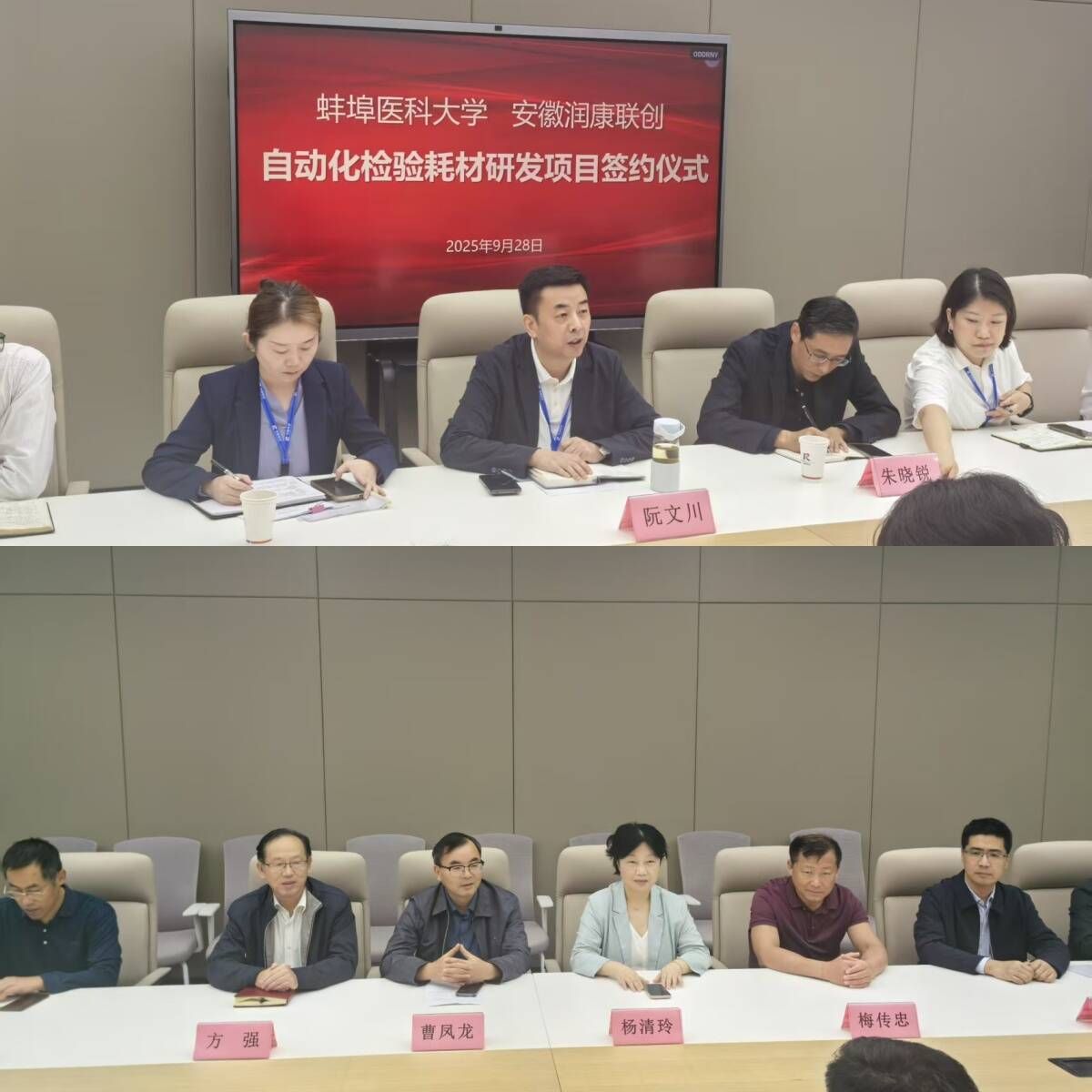 为进一步推动医学检验领域的产学研深度融合,促进教育链、人才链与产业链的有机衔接,9月28日下午,蚌埠医科大学检验医学院与安徽润康联创生物科技有限责任公司在蚌埠医科大学大健康产业园正式签署《自动化检验分析仪通用耗材关键技术研发和产业化》项目合作协议,蚌埠医科大学科研处副处长曹凤龙,检验医学院党委书记方强、学院院长杨清玲、党委副书记梅传忠以及博士团队,安徽润康联创生物科技有限责任公司常务副总经理阮文川、财务总监朱晓锐、实验室主任张珍珍以及相关科室业务骨干出席签约仪式。