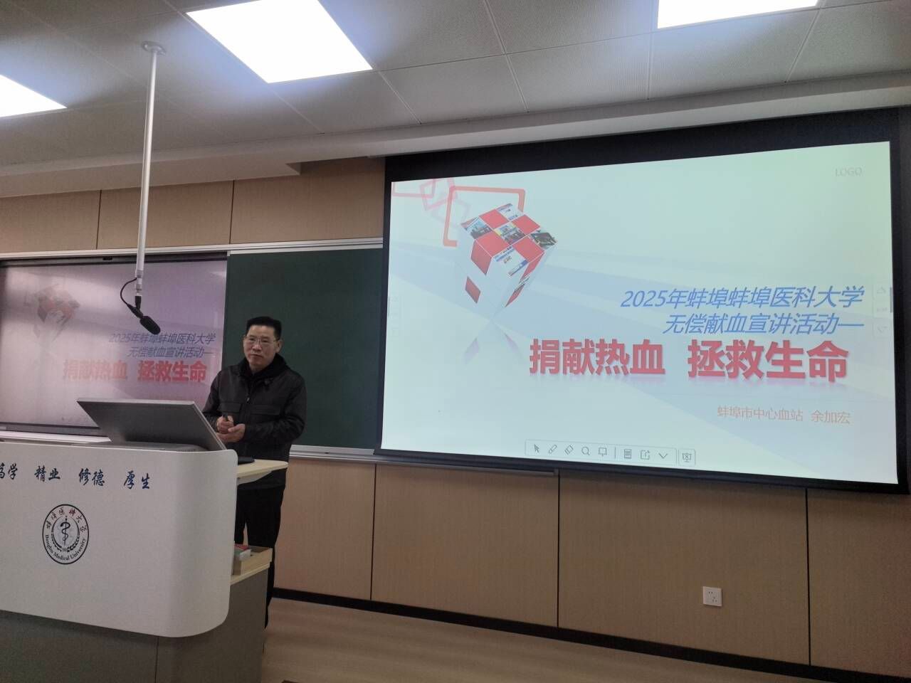为扎实推进新生入学教育,弘扬无私奉献的公益精神,引导医学生树立社会责任感与职业使命感,11月25日,检验医学院特邀蚌埠市中心血站副站长余加宏为2025级新生带来一场主题鲜明、内容详实的无偿献血知识宣讲会,将公益教育与医学素养培育深度融合,为新生成长注入青春正能量。