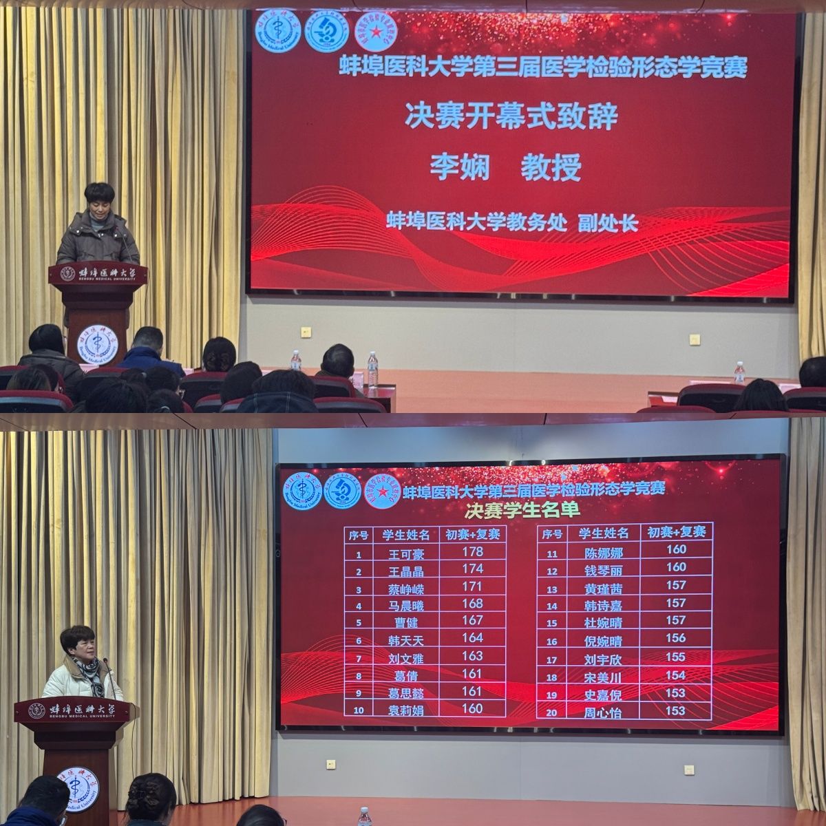 决赛开幕式于大学术报告厅举行,我校教务处副处长李娴教授、检验医学院党政领导方强、杨清玲等出席,安徽省立医院丁邦胜教授、蚌埠市第三人民医院郑岚主任等长三角细胞形态学诊断专科联盟专家及校内教师担任评委。